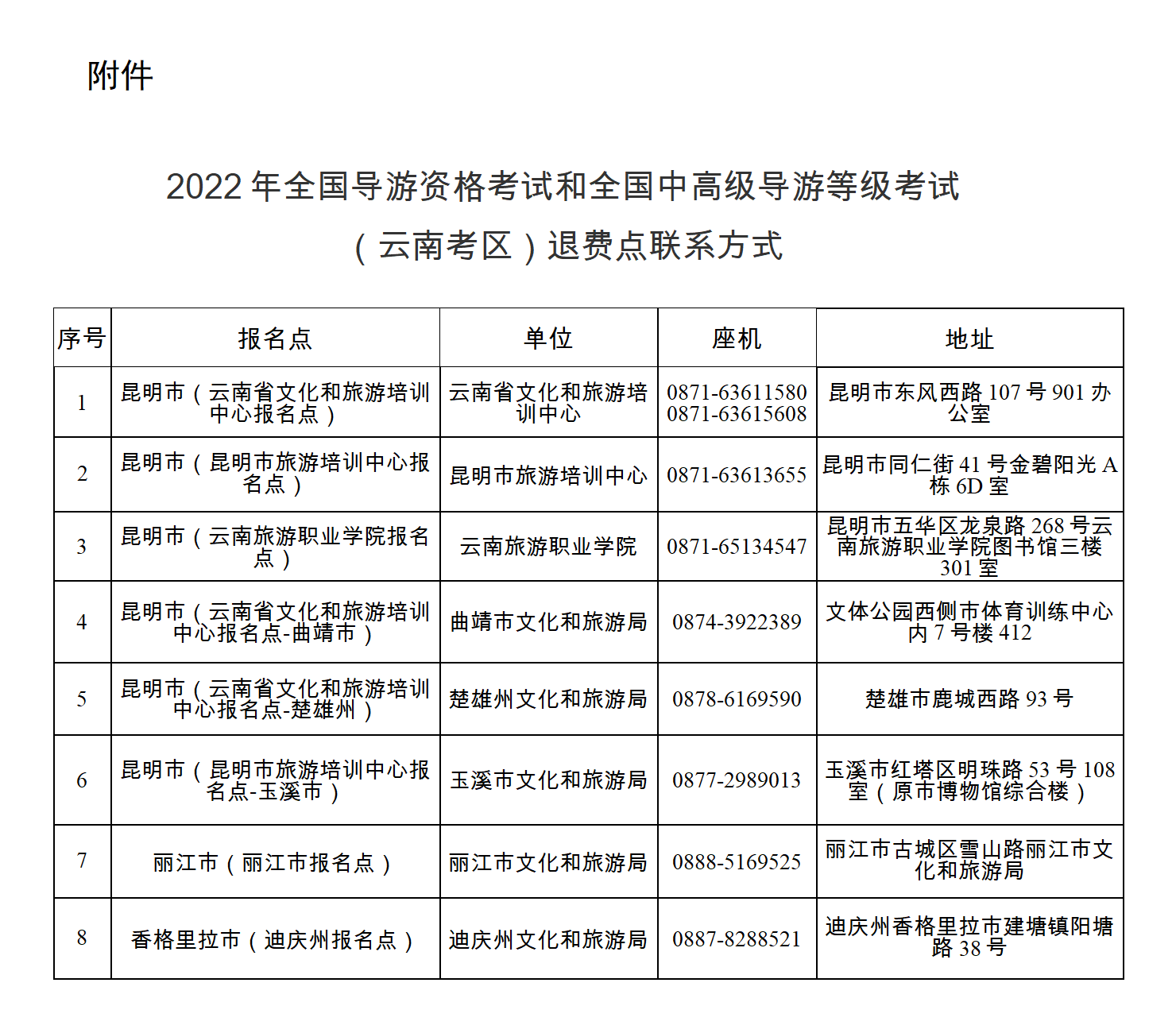 附件:2022年全國(guó)導(dǎo)游資格考試和全國(guó)中高級(jí)導(dǎo)游等級(jí)考試(云南考區(qū))退費(fèi)點(diǎn)聯(lián)系方式