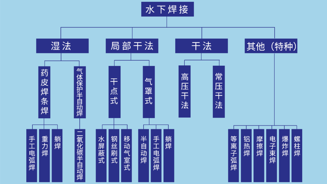 水下焊接如何分類,目前還沒有統(tǒng)一的規(guī)定。一般都從水下焊接所處的特殊環(huán)境,將水下焊接大體分為三類:濕法水下焊接、干法水下焊接和局部干法水下焊接。但隨著水下焊接技術(shù)的發(fā)展,又出現(xiàn)了一些新的水下焊接方法,如水下螺柱焊、水下爆炸焊、水下電子束焊和水下鋁熱焊等。這些焊法還難以確切地歸于哪一類,故暫按下圖分類。