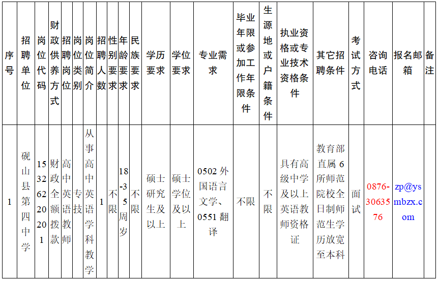 本次緊缺崗位招聘采取網(wǎng)絡(luò)報名或現(xiàn)場報名的方式進行。網(wǎng)絡(luò)報名郵箱為:zp@ysmbzx.com,咨詢電話:0876-3063576。現(xiàn)場報名可到硯山縣第四中學(xué)進行報名。