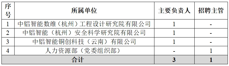 根據(jù)工作需要,中鋁智能科技發(fā)展有限公司(以下簡稱中鋁智能)決定面向社會(huì)公開招聘部分人員,現(xiàn)將有關(guān)事項(xiàng)公告如下: