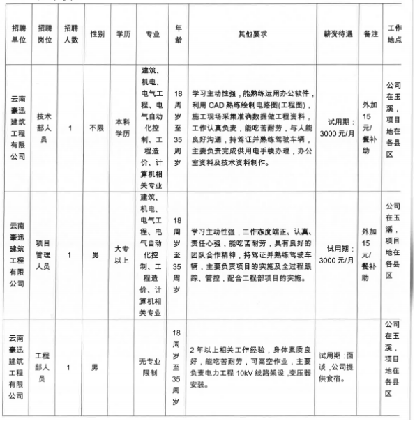 云南豪迅建筑工程有限公司因工作需要,委托澄江市啟澄人力資源有限責任公司,面向社會公開招聘技術(shù)工作人員3名,現(xiàn)將有關(guān)事項公告如下: