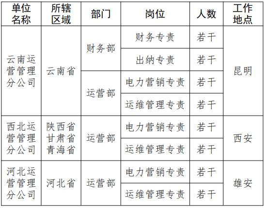 根據(jù)業(yè)務(wù)發(fā)展需要,現(xiàn)面向社會(huì)(包括中電工程本部及所屬企業(yè))開(kāi)展開(kāi)發(fā)投資公司云南、西北、河北運(yùn)營(yíng)管理分公司相關(guān)崗位招聘工作,具體招聘事項(xiàng)公告如下: