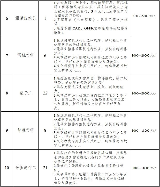 原則上年齡一般不超45周歲,特殊崗位技術(shù)人才可適當(dāng)放寬年齡至50周歲以內(nèi),但需個(gè)人確保到齡退休時(shí),養(yǎng)老保險(xiǎn)繳費(fèi)年限符合退休條件;持有井下相關(guān)操作技能等證書(shū)優(yōu)先考慮;身體健康,無(wú)相關(guān)職業(yè)禁忌癥。