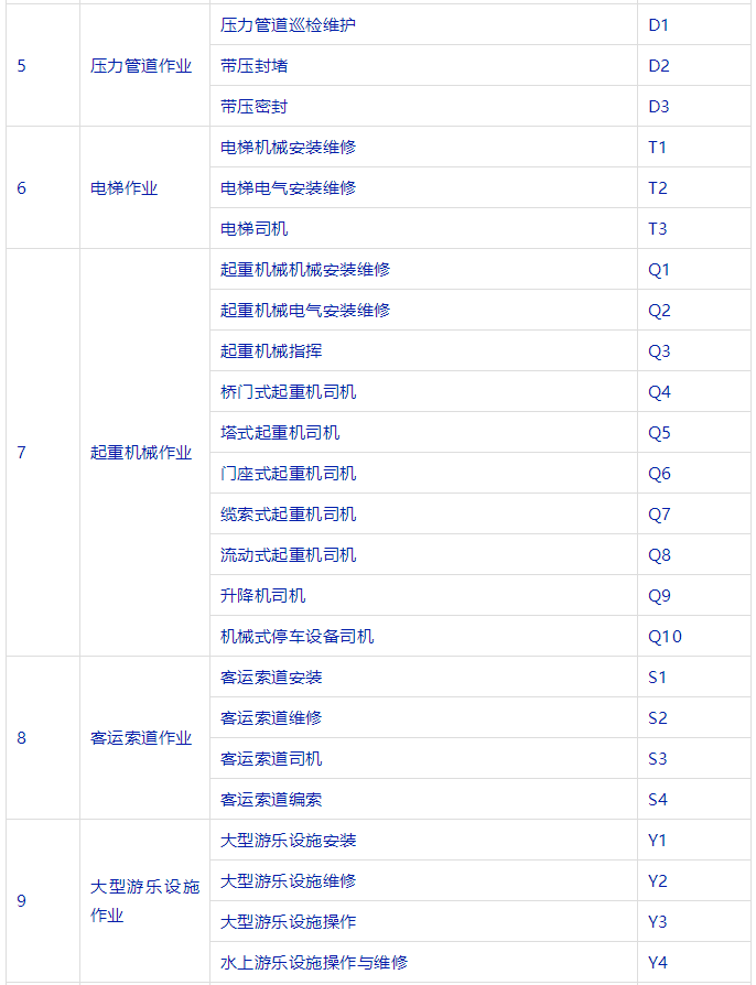 特種設(shè)備安全管理人員、叉車司機(jī)、起重機(jī)司機(jī)、起重機(jī)指揮、壓力容器、鍋爐、氣瓶充裝、電梯安裝與維修、觀光車、客運索道操作與修理、大型游樂設(shè)施操作與維修等等。
