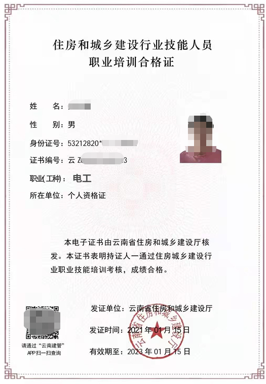 1、建筑電工證,由“云南住房和城鄉(xiāng)建設(shè)廳”頒發(fā),證書每2年進行一次“再教育繼續(xù)學(xué)習(xí)”,如果證書過期將需要重新考。
