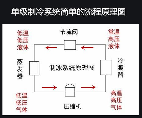 蒸汽壓縮式的冷庫(kù)制冷系統(tǒng)的流程原理,仍是大家熟悉的四大過程,即:壓縮——冷凝——節(jié)流——蒸發(fā)。相應(yīng)的配套的主要設(shè)備是制冷壓縮機(jī),冷凝器(風(fēng)冷式或水冷式),節(jié)流閥(氟制冷系統(tǒng)為熱力膨脹閥),蒸發(fā)器(冷庫(kù)常用的為直冷排管和風(fēng)冷式風(fēng)機(jī))。